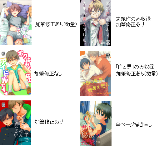 君と秘密の授業(キミに眠る俺の罪に改題) → 全ページ全コマ描き直し、同人誌に入っていた番外編「先生と秘密の授業」は未収録で、かわりに完全新作の番外編が入ってます。